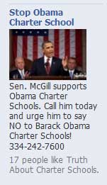 Left-wing conspiracy? The darkly creative minds behind the ads should at least get credit for attempting to upend the dominant narrative about school choice – that it’s a right-wing conspiracy. One ad suggests charter schools will protect gay and lesbian kids who are bullied in Alabama schools. Another says “Coming to Alabama soon: Barack Obama Charter School. Support our President and Charter Schools.” Yet others raise the specter of Muslim charter schools – and we all know what that means, don’t we?