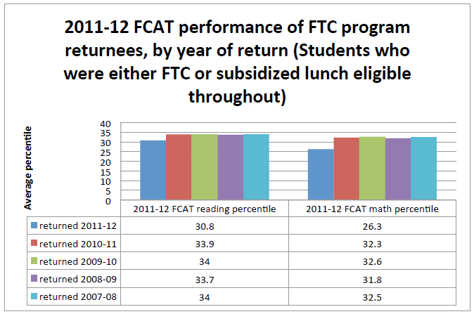 The other painful reality is that these students who return to public schools with lower test scores don’t improve over time in their new environment. For example, students who returned to public schools in 2007-08 score no differently in reading (34th percentile) or math (32.5th percentile) on the 2011-12 FCAT than students who returned to public schools four years later (33.9th percentile and 32.3rd percentile respectively).