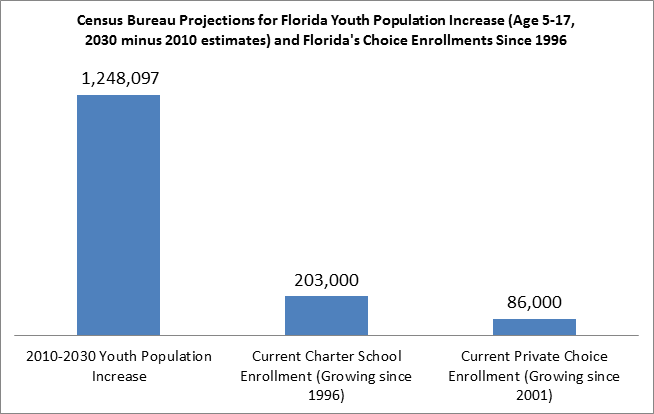 Even if Florida adopted a universal system of private school choice next year, and put a billion dollars aside for new charter school facilities for high-quality operators, it would merely slow the rate of growth for Florida school districts.