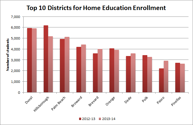 While the top 10 school districts remained the same in both 2012-13 and 2013-14, there were some shifts. The share of home-education students coming from Hillsborough declined, but the share in Pasco increased.