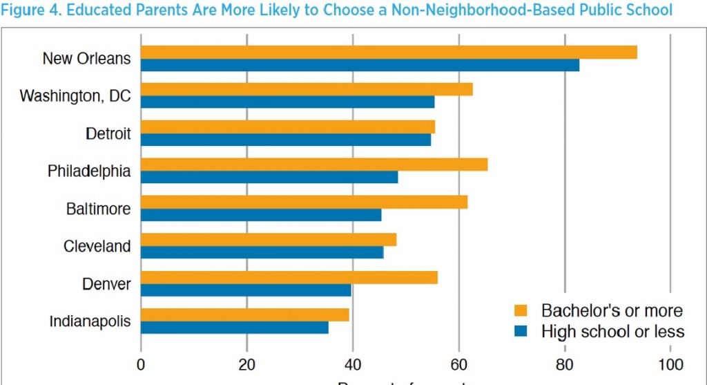 In general, more educated parents are more likely to choose options beyond their assigned school. Neerav Kingsland, however, notes districts that have invested in the infrastructure to support choice are starting to close that gap.