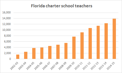 Charter school teachers in Florida are still just a fraction of all public school teachers in the state (about 7 percent). At the same time, Florida now has more charter school teachers than nine states have public school teachers, period.