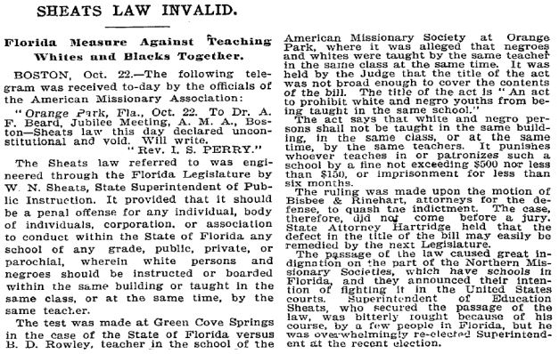 Known as the Sheats Law, a Florida statute barring black and white children from being taught in the same school was struck down in court, 120 years ago next month.