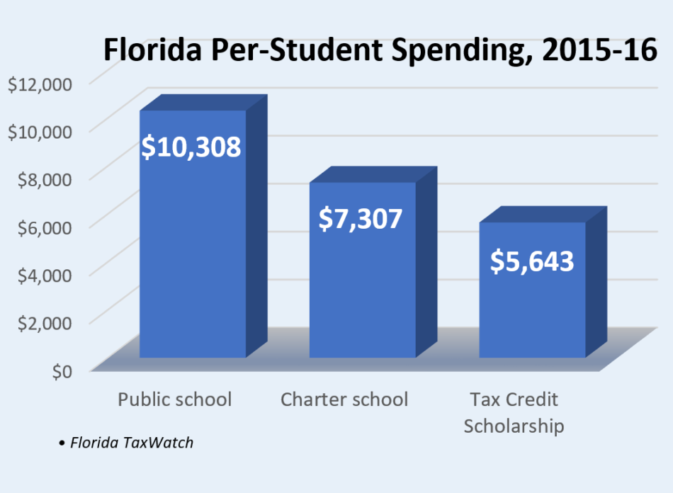 The “true cost,” as TaxWatch terms it, is especially relevant when comparing traditional public schools with charter schools and scholarship programs that are indexed mostly to the FEFP. The report projects charter schools last year spent $7,307 (the operational amount plus a small portion for construction), which is 71 percent of the cost of district-run public schools. Economically disadvantaged students on the Florida Tax Credit Scholarship* received an average of $5,643 – or 55 percent of what a traditional public education student received.