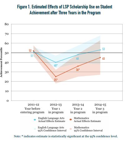 This highlights a consistent trend in other voucher studies, including a recent re-examination of voucher data from Washington D.C. When students leave public schools to accept private school scholarships, they tend to lose ground initially. Over time, their test scores get better as they adjust to new schools.