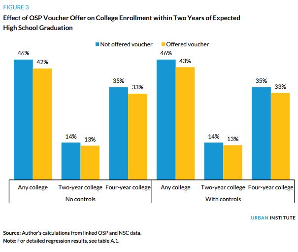 “Students who won a scholarship to attend a private school in Washington, D.C. enrolled in similar types of colleges at similar rates as students who were not offered a private school voucher,” Chingos wrote.