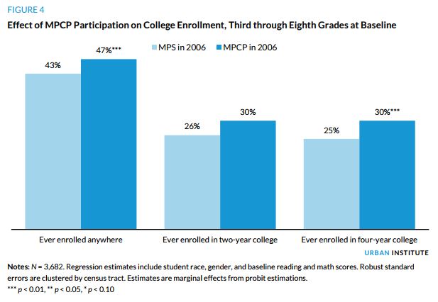 Researchers Patrick Wolf, John Witte and Brian Kisida found Milwaukee voucher students were 6 percentage points more likely to attend a four-year college than their public school peers. Milwaukee choice students were 1-2 percentage points more likely to graduate college, but that difference was not statistically significant.
