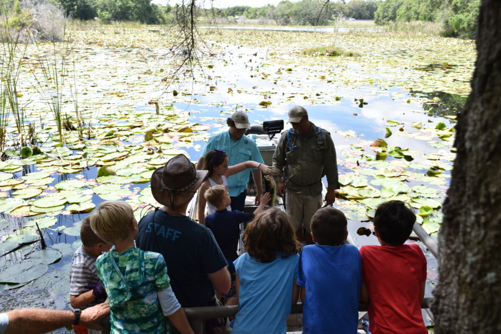 Students at Learning Gate Community School examine a largemouth bass, caught by biologists from the Florida Fish & Wildlife Conservation Commission during the school’s annual BioBlitz event.Biologists from the Florida Fish and Wildlife Conservation Commission steered their flatboat toward the banks of a small lake at Learning Gate Community School, where waiting students pointed to a patch of thick lily pads.