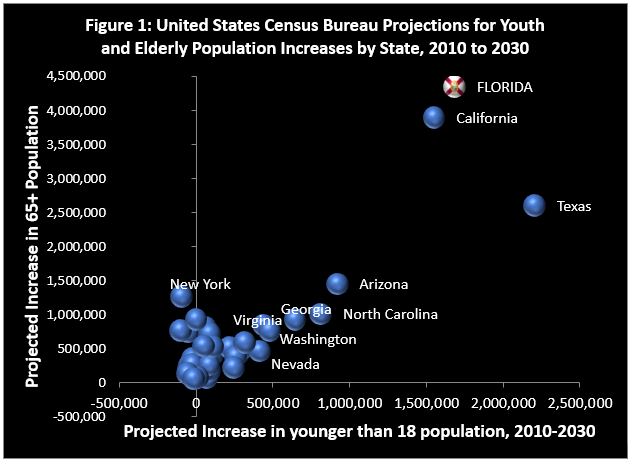 A few years back I visited these pages to discuss Florida’s age demographic change, and the challenges it will pose to policymakers, especially with regards to health care and education. Here’s the abridged version: Florida has lots of elderly people, and lots of young people, and relatively few working-age people paying for health care for the elderly and education for the young. This should not be terribly shocking if you have walked around a bit in Florida. The problem: demographers project Florida is growing large additional populations of elderly and young people. When you use Census projections to plot out all 50 states, it looks like: