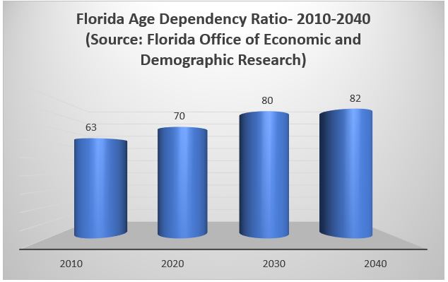 Here are the age dependency ratios for Florida in 2010, 2020, 2030 and 2040 based on EDR projections. Think of it this way: For every 100 working-age people pushing the cart of Florida’s social welfare state, how many elderly and young people do you have riding in the cart?