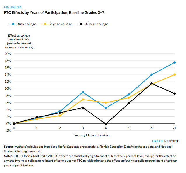 The analysis shows statistically significant benefits for students participating in the Florida Tax Credit Scholarship in both college attendance and degree competition compared to a matched sample of similar Florida public school students. Moreover, the study finds that the longer students participate in the program, the greater the size of positive effect.