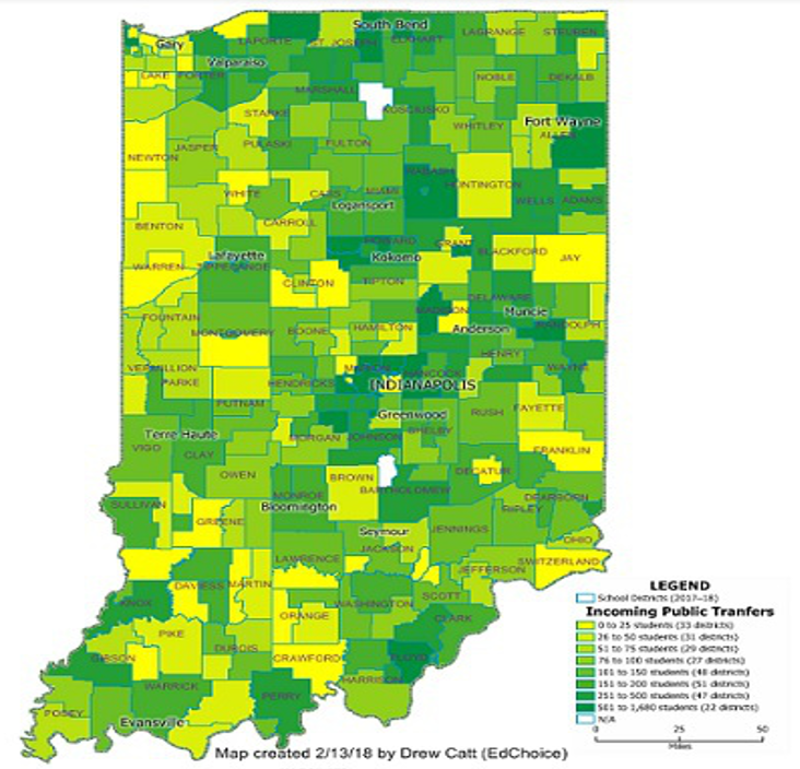 Changes to Indiana’s funding formula helped create momentum for families crossing district boundaries. The details of funding formulas as well as the breadth of choice programs can influence the amount of open enrollment. Indiana’s private choice programs have been geographically inclusive, and this is a move that Ohio will emulate after the 2019 legislative session. Hopefully, the move will help open Ohio suburban districts to transfers.