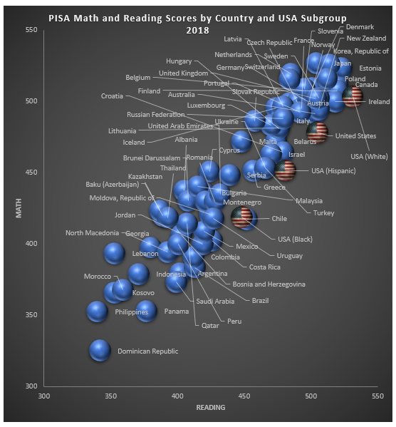 It has long been known that there is no direct correlation between spending on state schools and test scores; this is just more evidence supporting that general truth. Its reality does need to be reminded to clueless Democratic candidates whose only significant K-12 policy proposal is increasing spending on traditional district schools. Nonetheless, I’m surprised about the elision of the performance of the tens of millions of teens of Chinese ancestry from the above chart. Why were their children who took the test in Beijing, Hong Kong, Jiangsu, Macau, Shanghai, Singapore, the United States, and Zhejiang removed from your calculations?