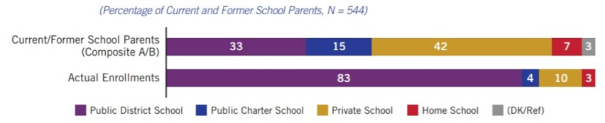 EdChoice and others have asked polling questions like this one by sector. In this example, approximately four times as many people preferred private and charter schools as actually attend those schools. This result indicates a certain level of dissatisfaction with district schools in the abstract, but that does not mean that in a truly demand-driven system, parents would lead a mass exodus from district schools.