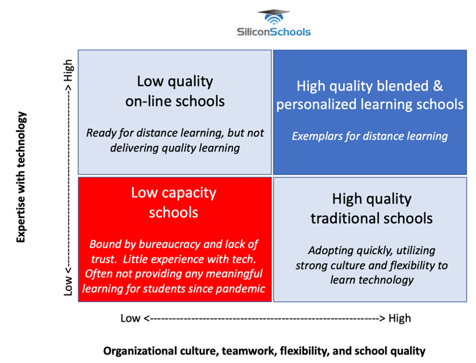 The graphic’s horizontal axis organizes schools by general effectiveness: culture, teamwork, flexibility, quality. The vertical axis organizes schools by expertise with technology, low to high. In the worst-case pandemic scenario, you are a child enrolled in a school system with an ineffective bureaucratic culture and a poor grasp of technology. In the best-case scenario – a highly effective, flexible and technically proficient organization – your school quickly reorganized efforts around distance learning to produce high-quality distance instruction.
