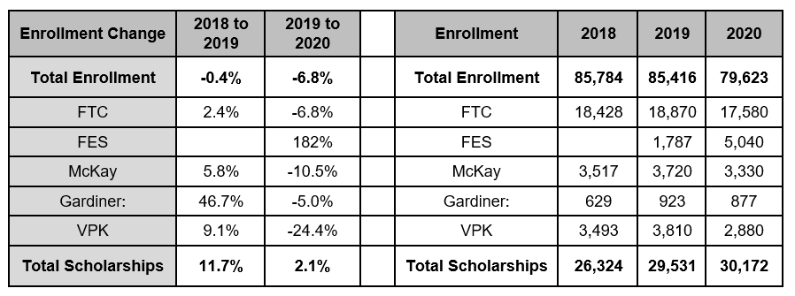 Overall, scholarship use among Catholic school families increased by 2.1%. Preliminary figures on Catholic school enrollment released by the Florida Conference of Catholic Bishops shows the number of students receiving the Family Empowerment Scholarship soaring from 1,787 in 2019 to 5,040 in 2020.
