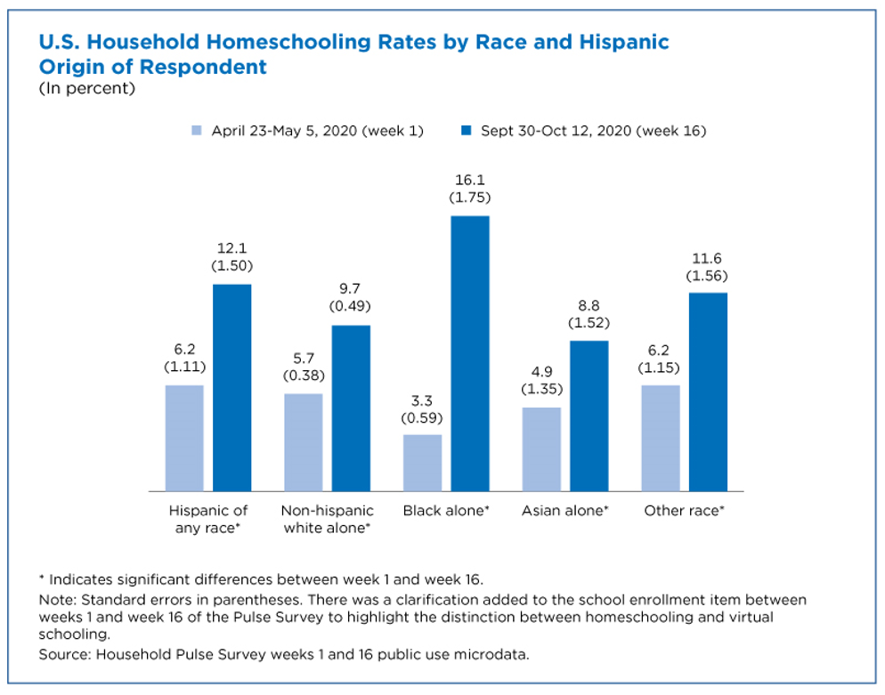 The U.S. Census Bureau earlier today released the results of a parent survey about homeschooling that asked parents to distinguish between distance learning while enrolled in a school and actual homeschooling. Results indicate a very large increase in reported homeschooling – a rise from 5.4% in spring 2020 to 11.1% in fall 2020.