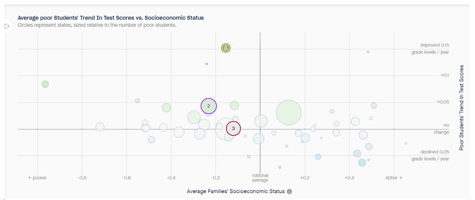 The horizontal axis measures the relative socio-economic status of low-income students in each state (most disadvantaged in Mississippi on the far left, most advantaged in New Hampshire on the far right). The vertical axis measures the trend in academic achievement for low-income students in percentages of a grade level gain or decline per year.