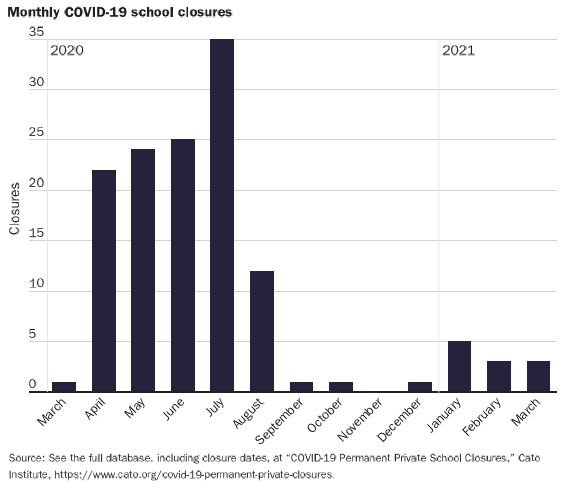 Cato’s COVID-19 Permanent Private School Closures tracker shows closures struck hardest at the beginning of the pandemic and climbed steadily each month from April through July, when closures peaked at 35. The hardest hit sector appears to be schools that are disproportionately low-cost.