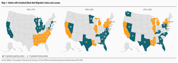 The Brookings Institution provided the following maps of the 1965 to 1970 period (left), 1995 to 2000 (middle) and 2015 to 2020 (right). For those squinting at their phones, yellow denotes top 10 states for net Black outmigration, dark green denotes top 10 states in Black in-migration. Things. Have. CHANGED.