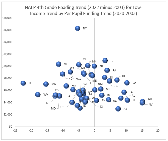 It’s award season here at reimaginED, and we’re reviewing a trend from “the Nation’s Report Card” for low-income students who tested in all 50 states between 2003 and 2022 on the fourth grade Reading exam. Basically, you want to see your state on the right side of the zero line on this chart that plots the literacy trend against a spending increase per pupil.