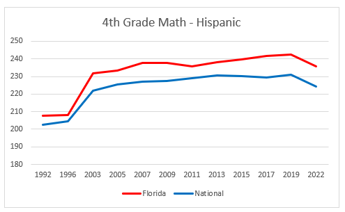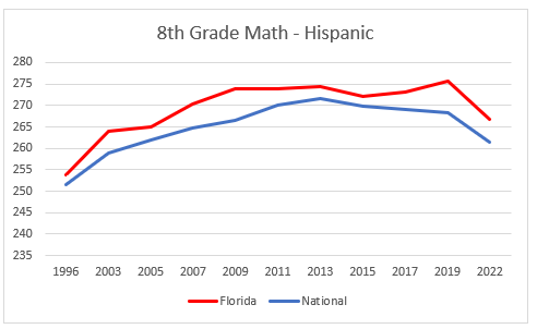 Hispanic students also performed better than their peers nationally, scoring about half a grade higher. However, Florida’s Hispanic eighth-grade student population lost 8.8 points compared to 6.8 points nationally.