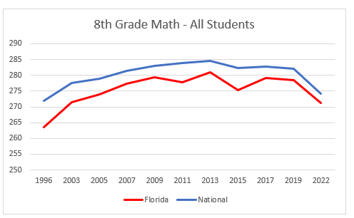 Where Florida’s fourth-grade Reading test scores dropped by an average of 0.6 points across all subgroups, students lost an average of 5.2 points in fourth-grade Math. The results were even worse for eighth graders.