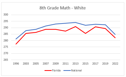 Florida’s white eighth-grade students perform below the national average in Math. Florida students saw a 7.3-point decline compared to 7.6-point decline compared to the national average.