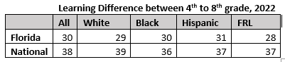 Subgroups nationally have nearly a difference of four grades in learning between fourth and eighth grade, while Florida tends to have about a three grade level difference.
