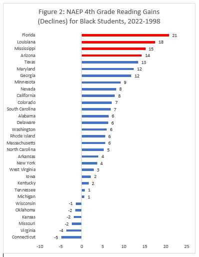 Backing the clock up to just before Florida’s election of Gov. Jeb Bush shows the state’s combined strategy (choice and literacy) is far out in front in driving gains. Note also that Louisiana, another state with a combined strategy, jumps into second place in the 1998 to 2022 chart.