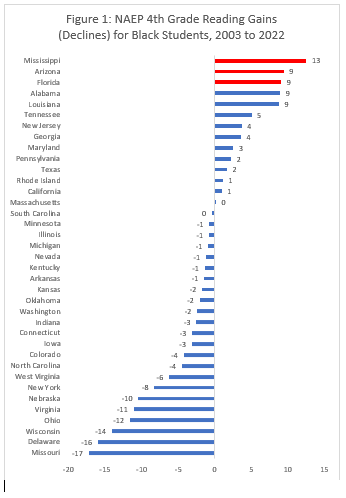 The chart above shows the academic trend from 2003 (the year all states began taking NAEP exams) to the most recent exams in 2022 for fourth grade reading for Black students. Note that on this test, 10 points roughly equals a grade level of average progress.