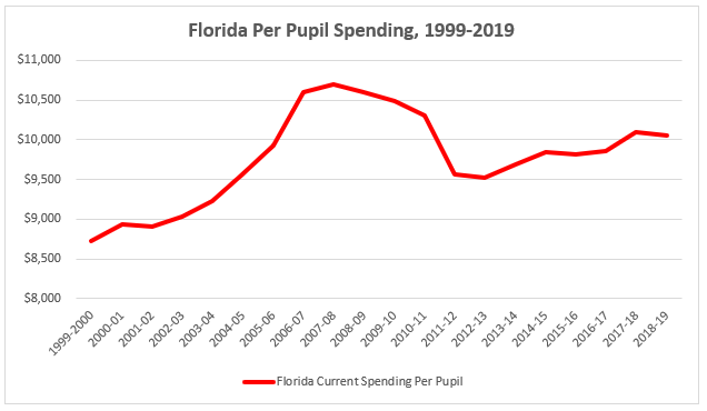 Like many states, Florida uses property taxes to help fund K-12 education. Florida’s red-hot housing market popped in 2006 with a global housing market crash. Despite the bankruptcies and collapsing housing values, Florida’s K-12 school system saw record-high per pupil spending in 2008.