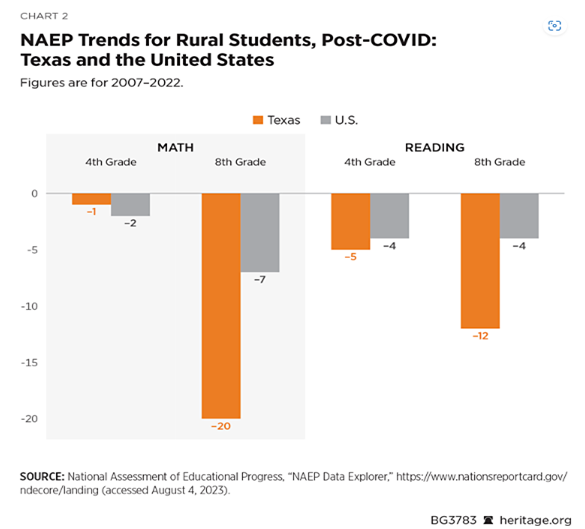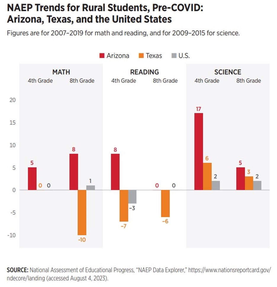 All of these options reach into rural Arizona communities. Has Arizona rural education suffered “destruction?” No. All Arizona school districts that were educating students in 1993 (the year before the advent of choice) are still educating students in 2023. Moreover, unlike Texas, the academic trends for rural Arizona students have been positive: