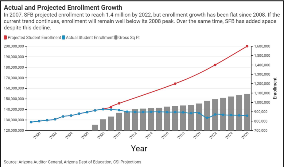 Between a Baby Bust that shows no sign of relenting, continued charter school enrollment growth and new kid on the block Universal ESA, you might think that Arizona school districts would buckle down and focus on putting more resources into the classroom. You would however be entirely mistaken. Instead, districts are asking voters for billions of dollars in (you guessed it!) new school construction! More than $4.3 billion, to be precise.