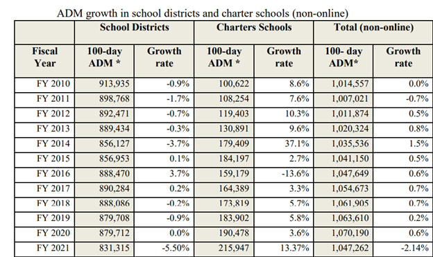Despite the statewide district enrollment decline that started that year, Arizona school districts added approximately 20 million square feet of new district school space. Note that the blue line in the Common Sense Institute chart above represents total K-12 enrollment, rather than district enrollment. What has been happening with district enrollment? Glad you asked: