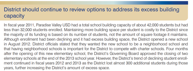 The district I live in, Paradise Valley Unified School District, is going out for a half billion dollars in total bond debt. In 2013, the Arizona auditor general noted that the district had a physical plant space for 42,000 students, but only 32,000 students enrolled. Therefore, the auditor general recommended leasing vacant space: