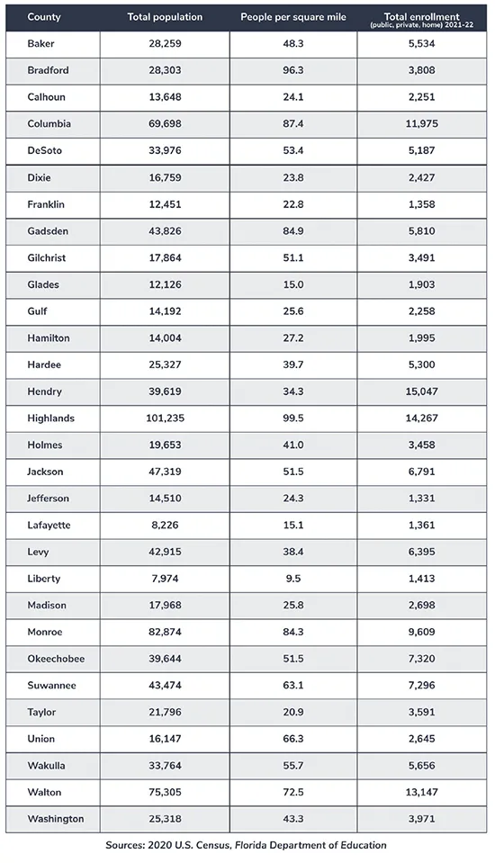 To be sure, the definition of “rural” can be fuzzy. Rural Florida isn’t the same as say, rural Alaska. For this brief, we rely on a definition for “rural county” that is used by the Florida Department of Health: any county that averages less than 100 people per square mile. We think this definition fairly meets popular conceptions of “rural.” It also conveniently lines up with how education data is routinely collected in Florida, where public school district lines correspond with county boundaries.