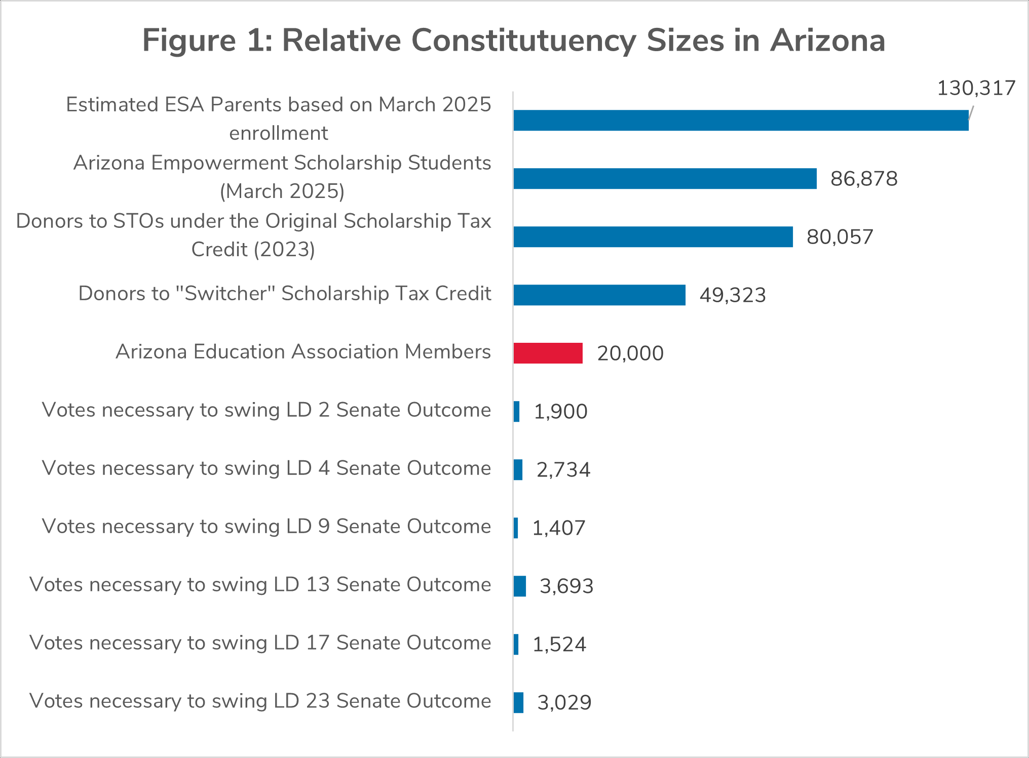 I put together the chart below based on a few different sources of information. Some numbers are from 2025; the tax credit numbers are from the state’s 2023 report. The tax credit donor numbers only count donations, rather than the number of members of the families who made the donation. There is certainly some double counting going on with the original and switcher credits, as many people claim both. The parent figure is an estimate that assumes 1.5 parents per ESA student in 2025 and does not consider the possibility of other relatives. The below list is by no means exhaustive, or even close to it. Also included are the number of swing votes each losing candidate would have needed to win in the swing Arizona Senate races.