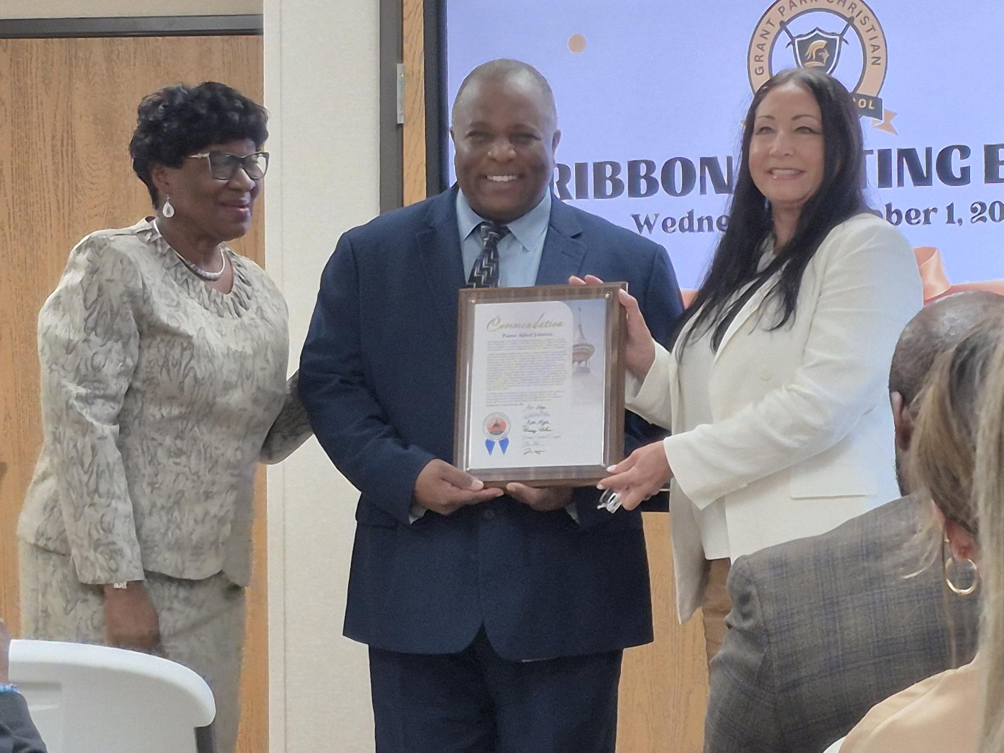 The Rev. Alfred Johnson, founder of Faith Action Ministry Alliance and Grant Park Christian Academy, receives a commendation from Hillsborough County Commissioners Gwen Meyers, left, and Donna Cameron Cepeda, right. The Tampa non-profit organization and the school receive bipartisan support from local leaders.