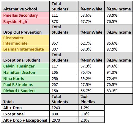 Last year, the Pinellas district placed 1.2 percent of its low-performing and chronically disruptive students in special schools. When including schools for “exceptional students” (which includes special needs as well as mentally disturbed students) the enrollment is 2 percent of the district’s entire student population. The vast majority of these kids are nonwhite and low-income, as this chart shows: