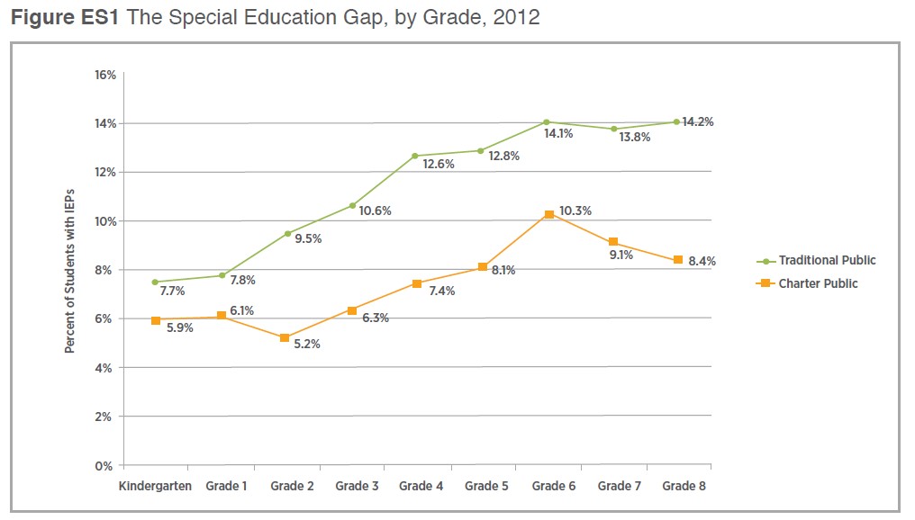Previous research by Jay P. Greene of the University of Arkansas found public schools might be over prescribing this “specific learning disability” classification, in part due to the additional funding provided by state and federal programs. Charter schools may simply be recognizing that these students aren’t struggling because of a learning disability, but because of other factors (perhaps a disruptive home environment, lack of good nutrition, or poor instruction from a previous teacher).
