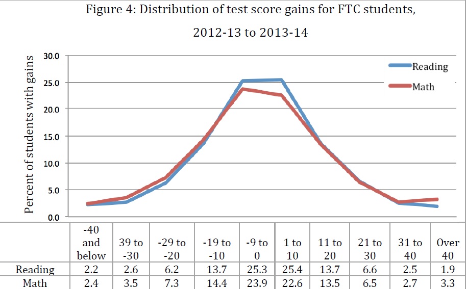 “[T]he typical FTC student tends to maintain his or her relative position in comparison with all students nationally both in mathematics and reading,” they write. “It is important to note that these national comparisons pertain to all students nationally, and not just students from low-income families.”
