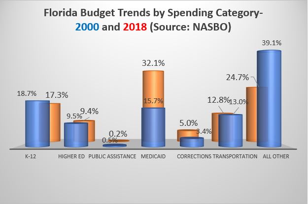 The Florida education system of 2018 was demonstrably superior to the one of 2000 across a variety of measures, including NAEP, graduation rates, K-12 students earning college credit and industrial certifications by exam, and higher education success. Hundreds of thousands of additional students enrolled in Florida schools during this period, the student body became increasingly majority minority, and academic achievement improved. Not only did you accomplish all of this, you did it with a slightly smaller share of the state’s budget (see first chart). It wasn’t easy, but you pulled it off.