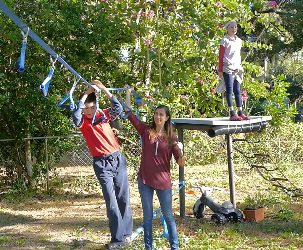 Using foam hand grips hanging from another rope, he pulled himself toward a big oak at the end of the line. “You’re getting closer,” encouraged his mom, Stephanie Conner. “Now touch the tree.” Eli finished with a triumphant tap.