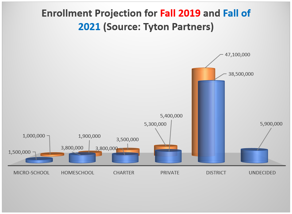 Part 2 of the study includes estimated enrollment by school sector for this fall. Among families who have made decisions for their children, approximately 72% chose a district school, with 28% choosing something different. If the 5.9 million families who are still undecided break in similar fashion, district enrollment could dip to levels not experienced in this millennium.