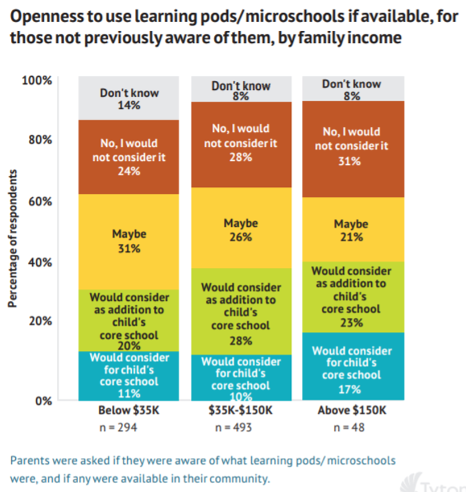 Additionally, the survey queried families who were unaware of learning pods and micro-schools on their potential interest. A majority across all income levels expressed interest in utilizing pods and micro-schools for either supplemental or full-time attendance.