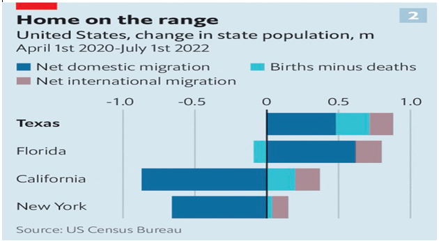 Florida and Texas share a number of things in common; large, diverse populations, Republican state leadership, and strong economic and population growth. Both Florida and Texas have been welcoming migrants, especially from California and New York, where their numbers are declining.