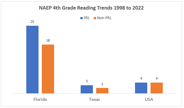 Texas reform efforts by comparison have been timid, and it shows in crucial outcomes such as NAEP fourth grade reading: