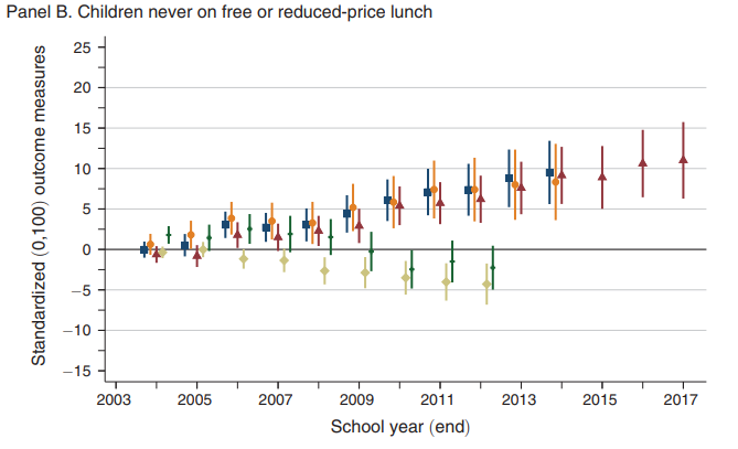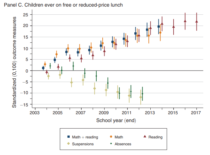 The benefits were uneven in a different way. They appeared stronger for lower-income students who qualified for free and reduced-price lunch (and thus were all eligible for means-tested scholarships).