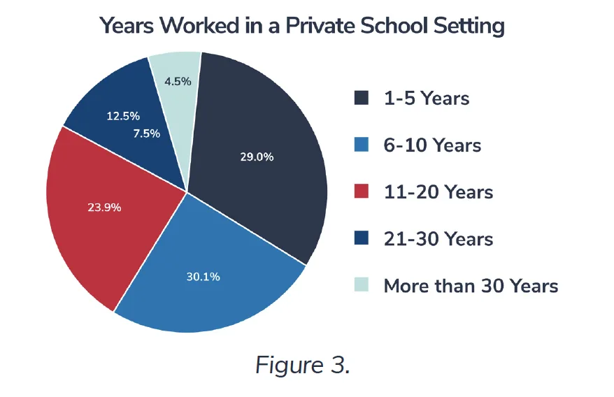 Most respondents (59.1 percent) had worked in private schools 10 years or less. See Figure 3.